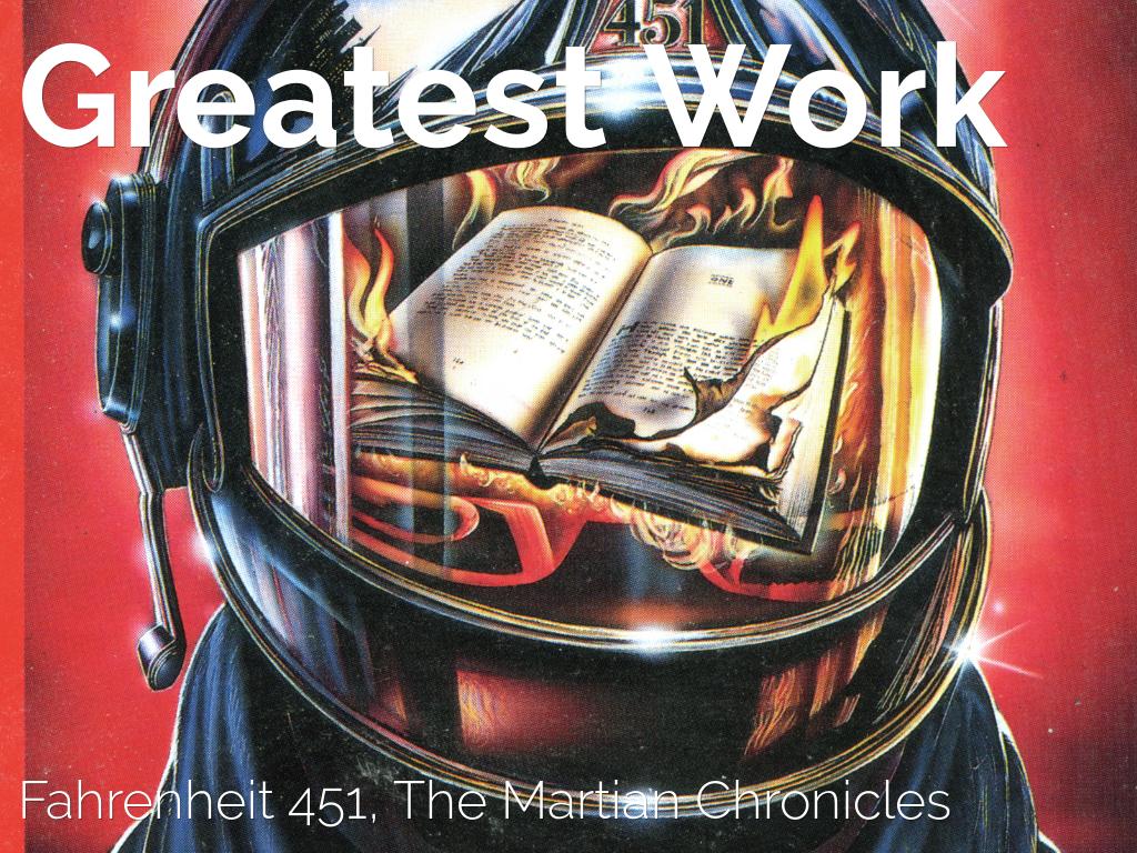 His best known novel is Fahrenheit 451, a dystopian study of future American society in which critical thought is outlawed. His famous works are The Martian Chronicles and the short story The Veldt. He decided to become a writer at the age of 12 or 13. He participated in his school’s drama club and occasionally befriended Hollywood Celebrities. He was also known as a prolific author, he wrote for several hours everyday throughout his entire life, allowing him to publish more than 30 books, close to 600 short stories, and numerous poems, essays, screenplays, and plays.