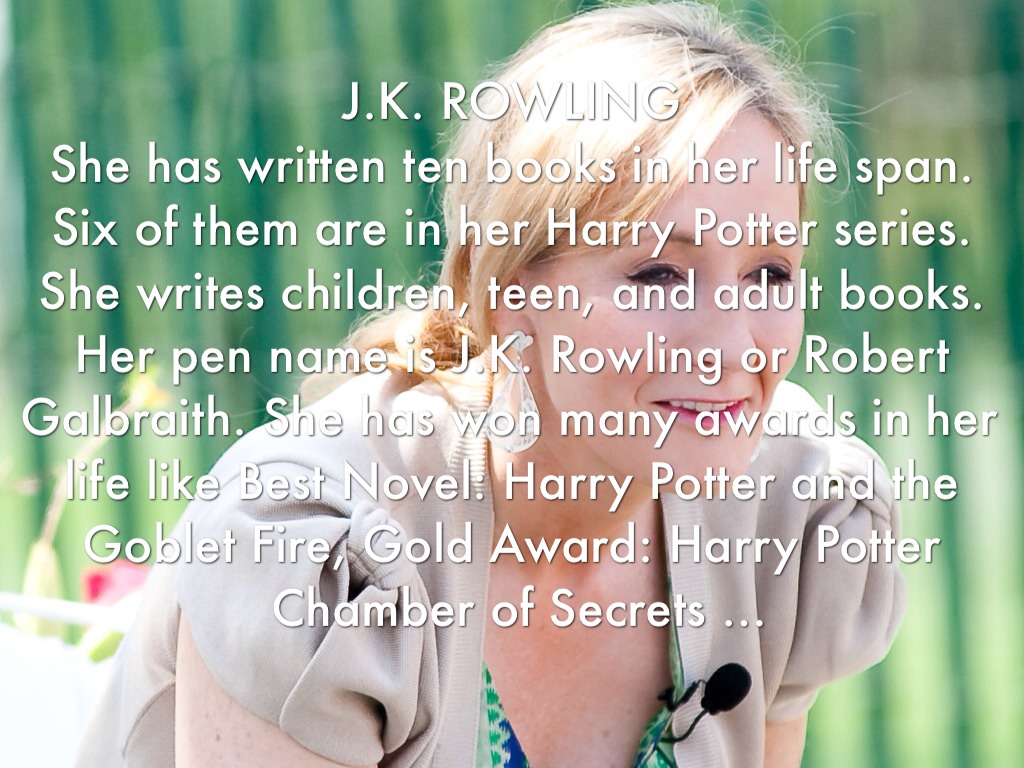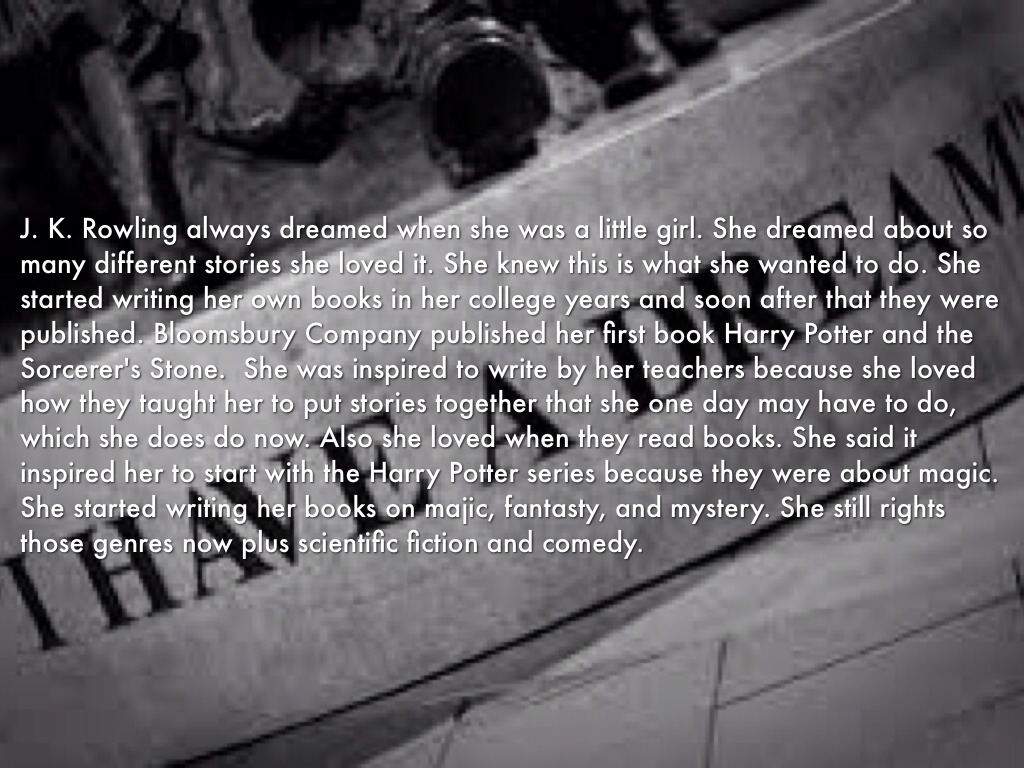 J. K. Rowling always dreamed when she was a little girl. She dreamed about so many different stories she loved it. She knew this is what she wanted to do. She started writing her own books in her college years and soon after that they were published. Bloomsbury Company published her first book Harry Potter and the Sorcerer's Stone. She was inspired to write by her teachers because she loved how they taught her to put stories together that she one day may have to do, which she does do now. Also she loved when they read books. She said it inspired her to start with the Harry Potter series because they were about magic. She started writing her books on majic, fantasty, and mystery. She still rights those genres now plus scientific fiction and comedy.