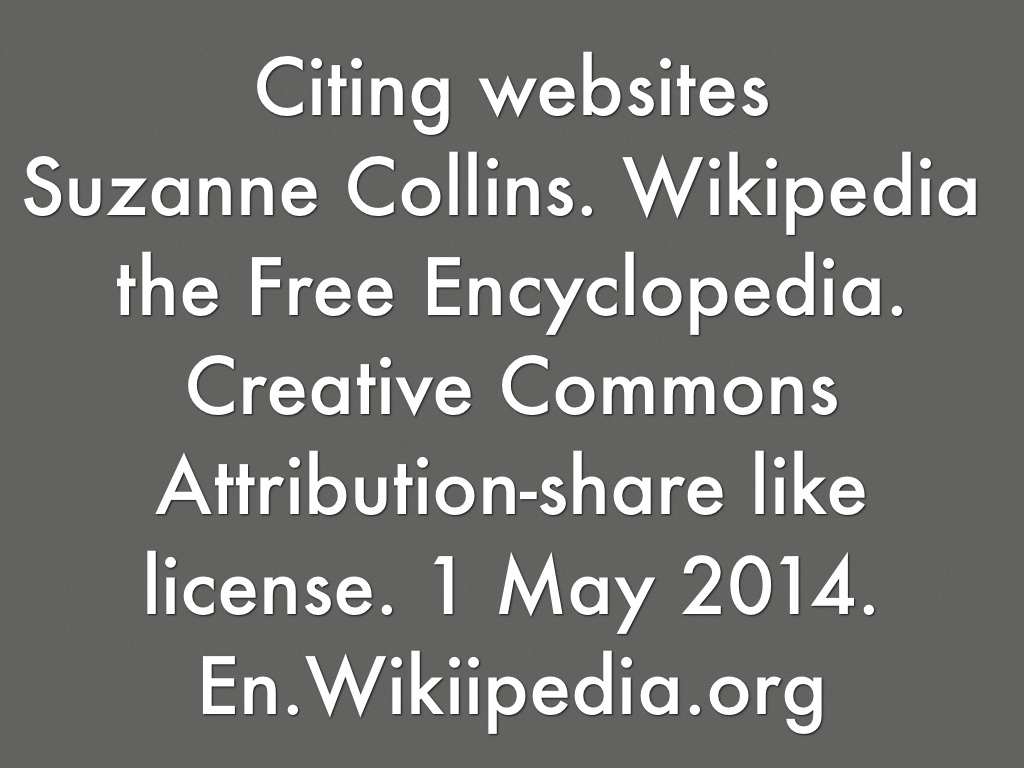 Suzanne Collins. Wikipedia the Free Encyclopedia. Creative Commons Attribution-share like license. 1 May 2014.