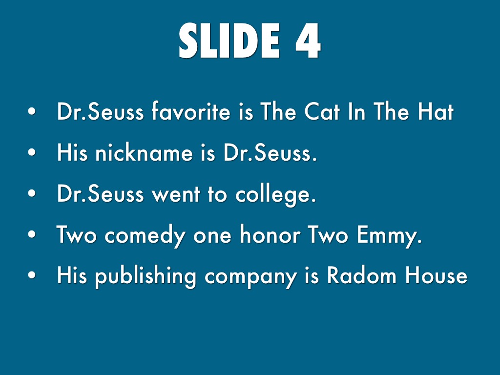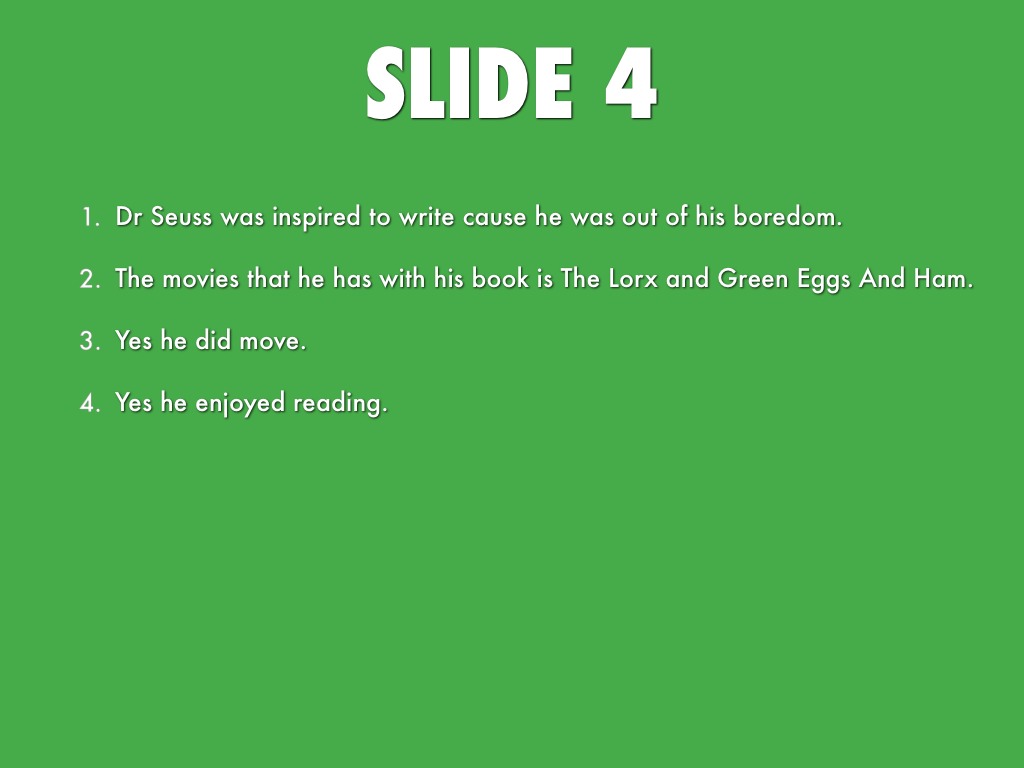 • Dr Seuss was inspired to write cause he was out of his boredom.