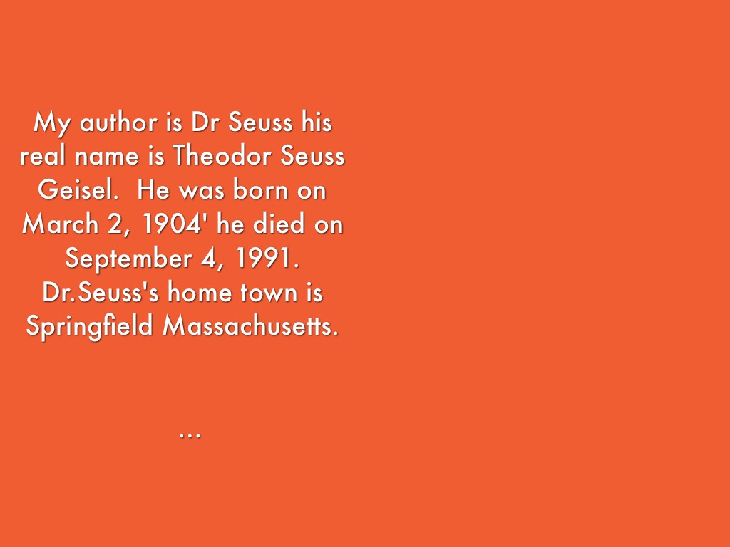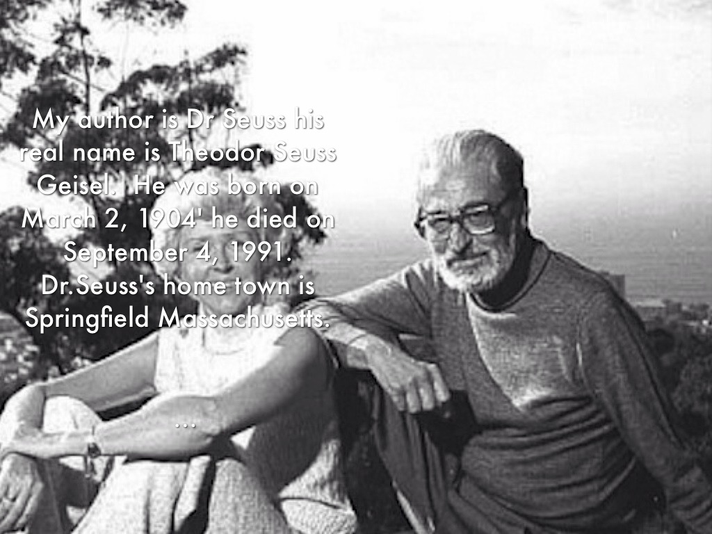My author is Dr Seuss his real name is Theodor Seuss Geisel. He was born on March 2, 1904' he died on September 4, 1991.
