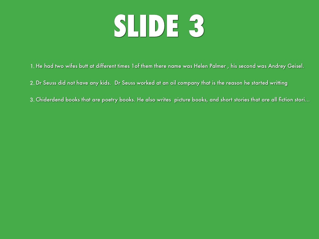• Dr Seuss did not have any kids. Dr Seuss worked at an oil company that is the reason he started writting