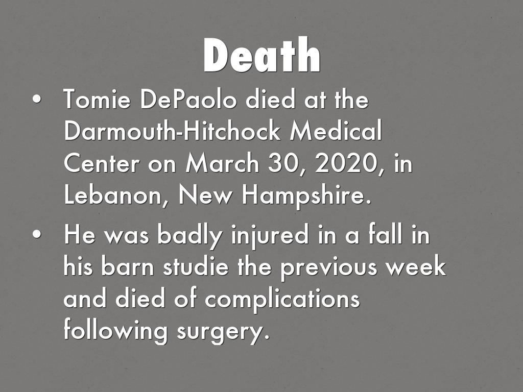 Tomie DePaolo died at the Darmouth-Hitchock Medical Center on March 30, 2020, in Lebanon, New Hampshire.