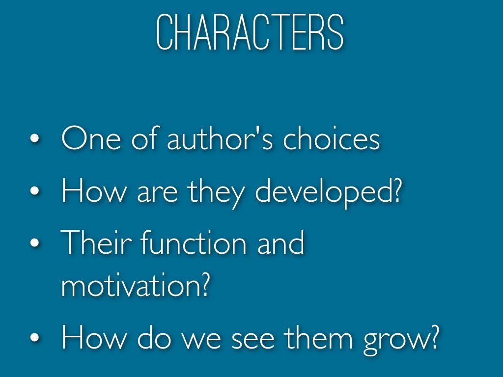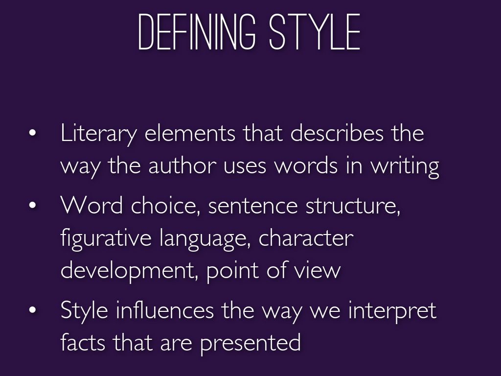 Word choice, sentence structure, figurative language, character development, point of view