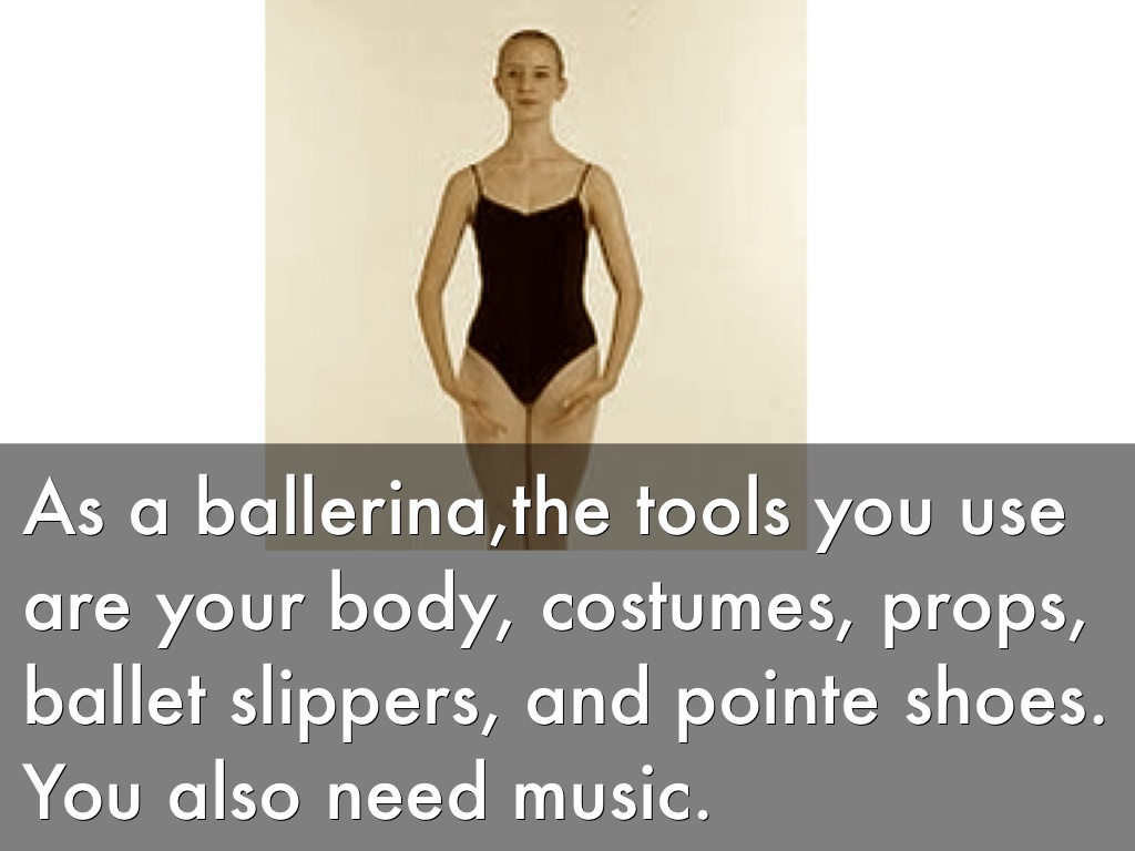 As a ballerina,the tools you use are your body, costumes, props, ballet slippers, and pointe shoes. You also need music.