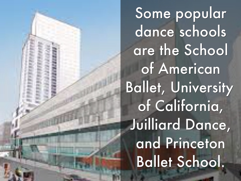 Some popular dance schools are the School of American Ballet, University of California, Juilliard Dance, and Princeton Ballet School.