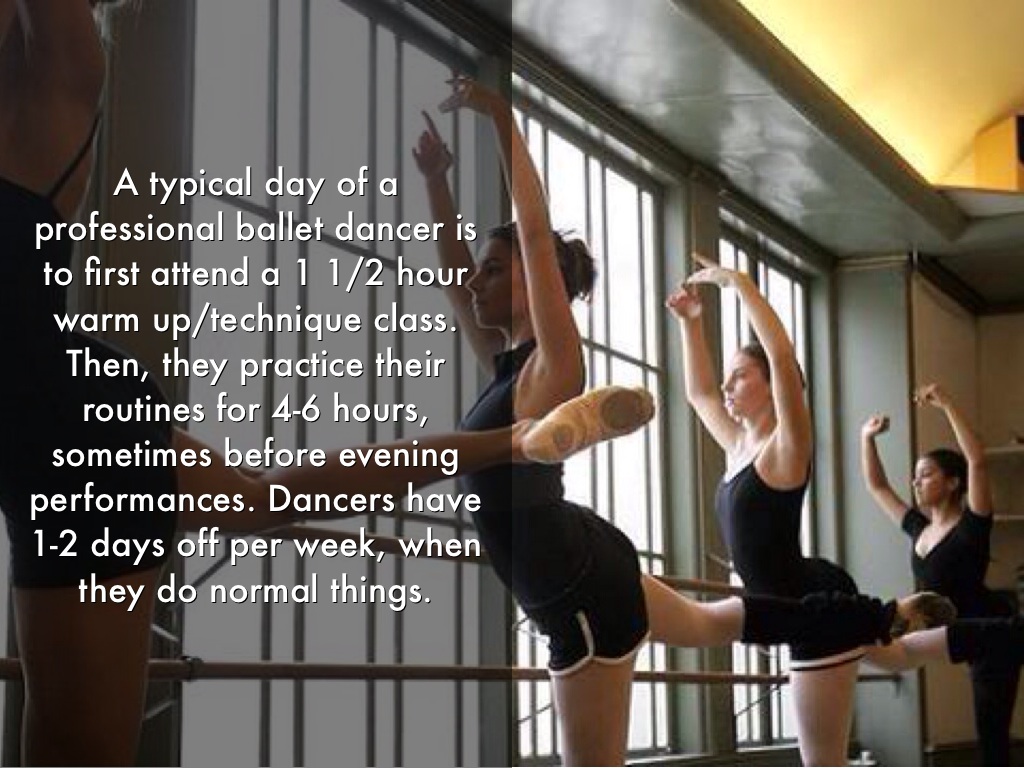 A typical day of a professional ballet dancer is to first attend a 1 1/2 hour warm up/technique class. Then, they practice their routines for 4-6 hours, sometimes before evening performances. Dancers have 1-2 days off per week, when they do normal things.