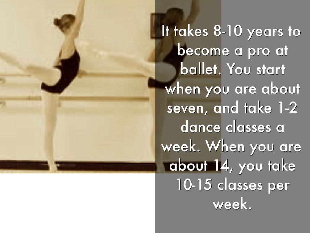 It takes 8-10 years to become a pro at ballet. You start when you are about seven, and take 1-2 dance classes a week. When you are about 14, you take 10-15 classes per week.