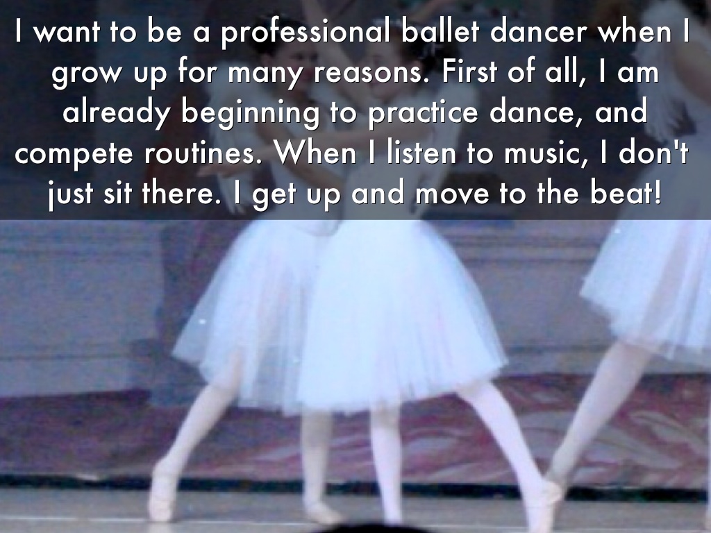 I want to be a professional ballet dancer when I grow up for many reasons. First of all, I am already beginning to practice dance, and compete routines. When I listen to music, I don't just sit there. I get up and move to the beat!