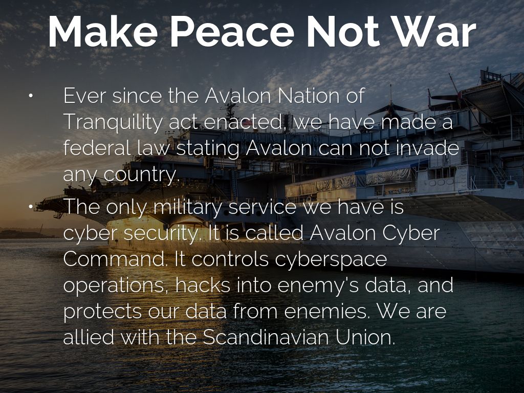 The only military service we have is cyber security. It is called Avalon Cyber Command. It controls cyberspace operations, hacks into enemy's data, and protects our data from enemies. We are allied with the Scandinavian Union.