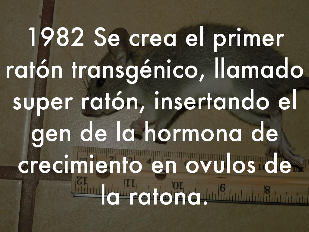 1982 Se crea el primer ratón transgénico, llamado super ratón, insertando el gen de la hormona de crecimiento en ovulos de la ratona.