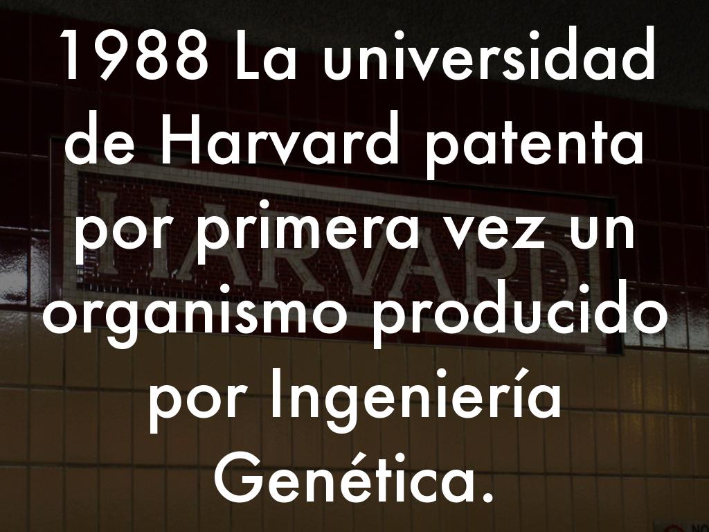 1988 La universidad de Harvard patenta por primera vez un organismo producido por Ingeniería Genética.