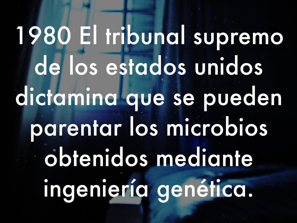 1980 El tribunal supremo de los estados unidos dictamina que se pueden parentar los microbios obtenidos mediante ingeniería genética.