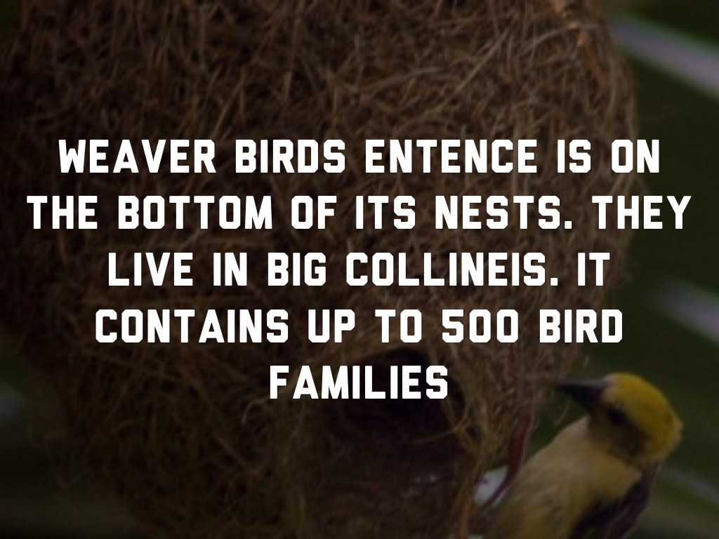 Weaver birds entence is on the bottom of its nests. They live in big collineis. It contains up to 500 bird families