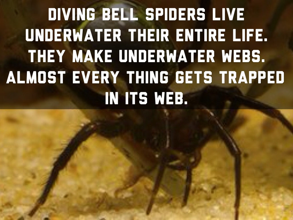 Diving bell spiders live underwater their entire life. They make underwater webs. Almost every thing gets trapped in its web.