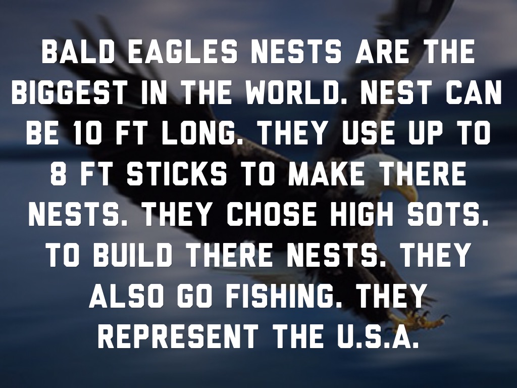 Bald eagles nests are the biggest in the world. Nest can be 10 ft long. They use up to 8 ft sticks to make there nests. They chose high sots. To build there nests. They also go fishing. They represent the u.s.a.