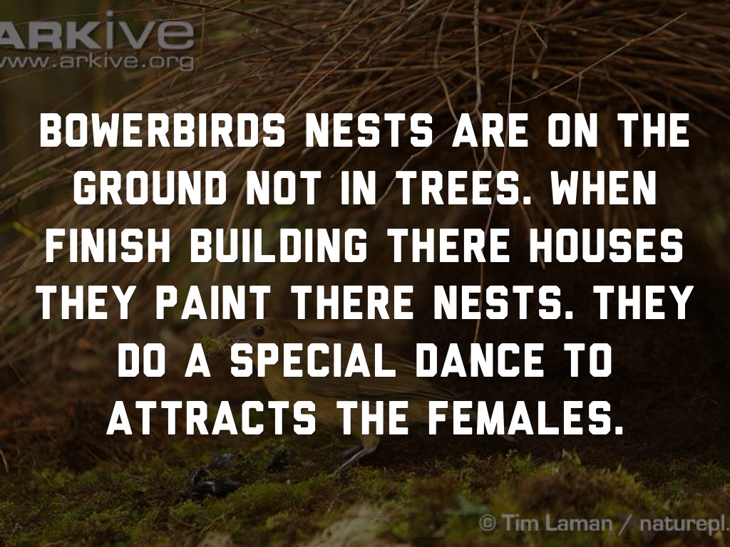Bowerbirds nests are on the ground not in trees. When finish building there houses they paint There nests. They do a special dance to attracts the females.