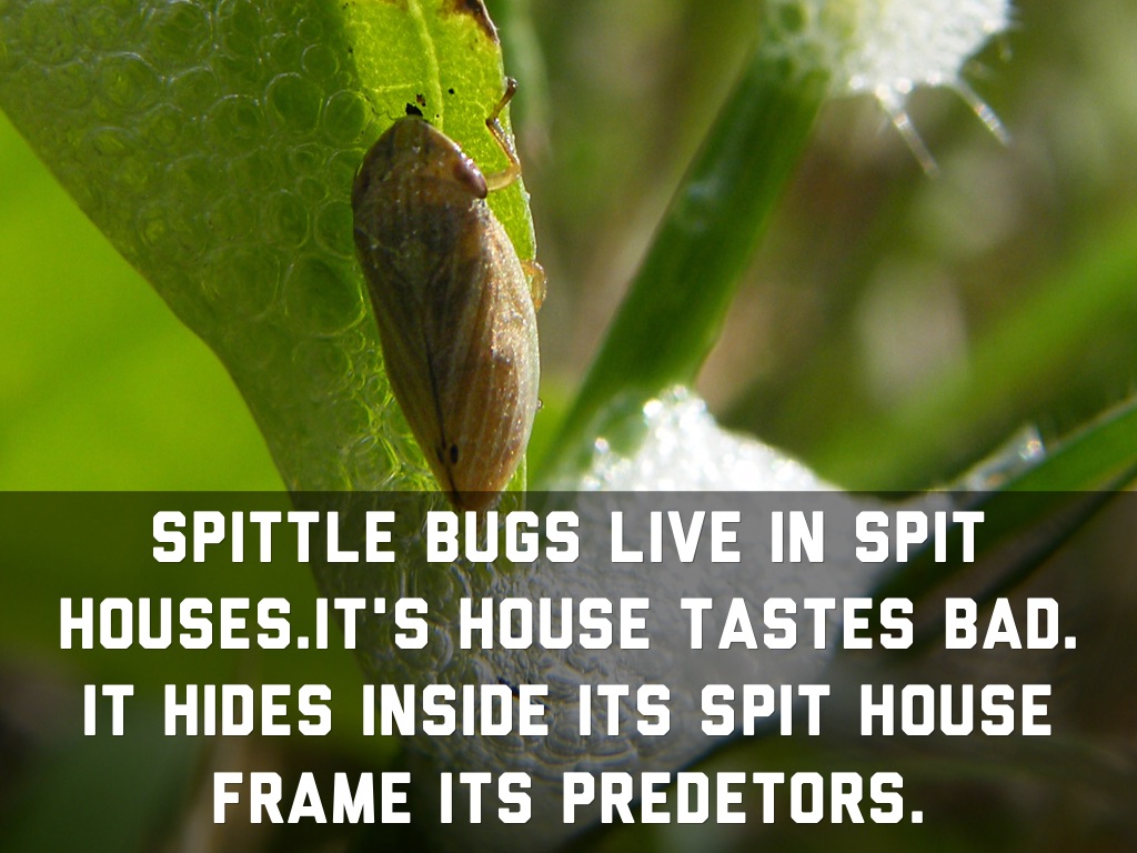Spittle bugs live in spit houses.It's house tastes bad. It hides inside its spit house frame its predetors.