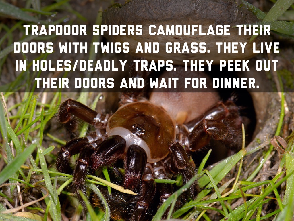 Trapdoor spiders camouflage their doors with twigs and grass. They live in holes/deadly traps. They peek out their doors and wait for dinner.