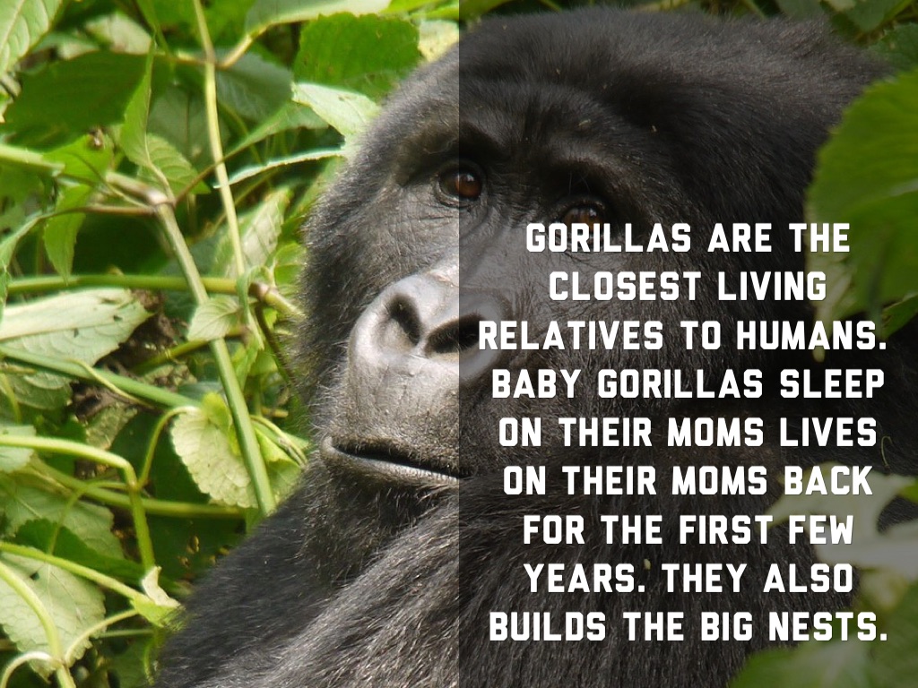 Gorillas are the closest living relatives to humans. Baby Gorillas sleep on their moms lives on their moms back for the first few years. They also builds the big nests.