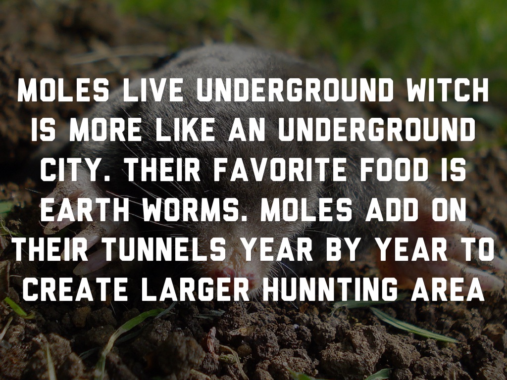 Moles live underground witch is more like an underground city. Their favorite Food is earth worms. Moles add on their tunnels year by year to create larger hunnting area