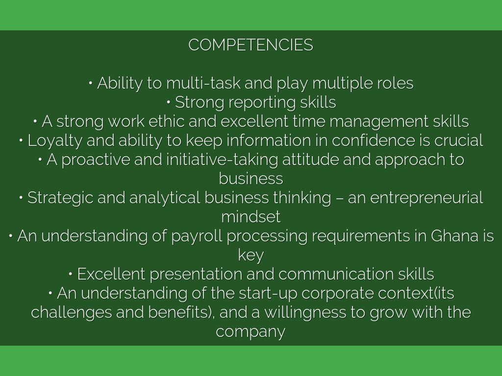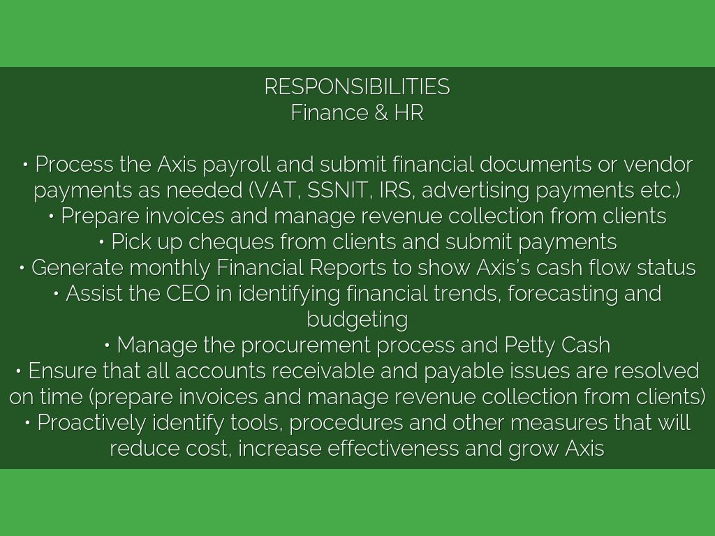 • Process the Axis payroll and submit financial documents or vendor payments as needed (VAT, SSNIT, IRS, advertising payments etc.)