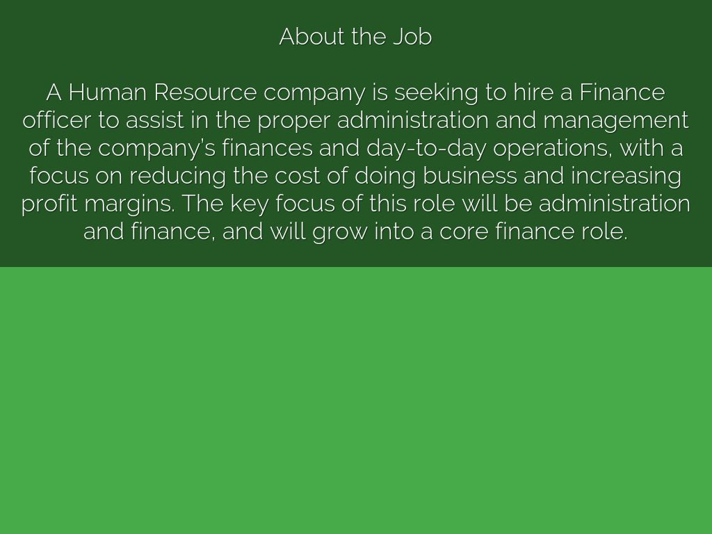 A Human Resource company is seeking to hire a Finance officer to assist in the proper administration and management of the company’s finances and day-to-day operations, with a focus on reducing the cost of doing business and increasing profit margins. The key focus of this role will be administration and finance, and will grow into a core finance role.