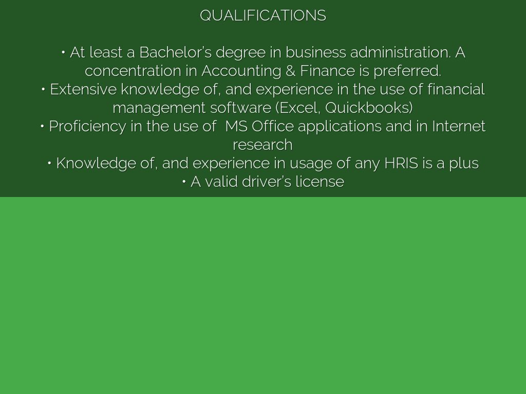 • At least a Bachelor’s degree in business administration. A concentration in Accounting & Finance is preferred.