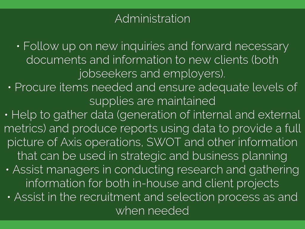 • Help to gather data (generation of internal and external metrics) and produce reports using data to provide a full picture of Axis operations, SWOT and other information that can be used in strategic and business planning