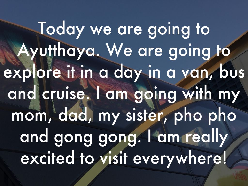 Today we are going to Ayutthaya. We are going to explore it in a day in a van, bus and cruise. I am going with my mom, dad, my sister, pho pho and gong gong. I am really excited to visit everywhere!