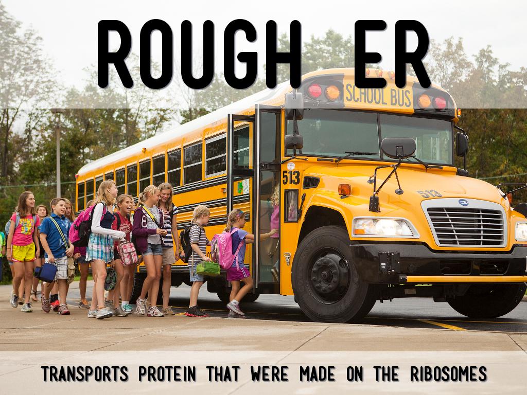 Rough ER transports proteins that were made on the ribosomes. Just like how school buses are used to transport students from home to school or vice versa.