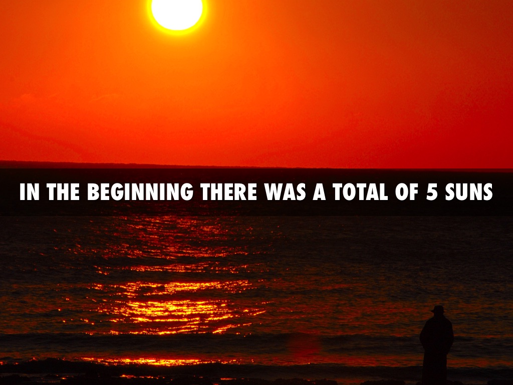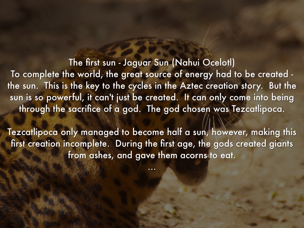 The first sun - Jaguar Sun (Nahui Ocelotl) To complete the world, the great source of energy had to be created - the sun. This is the key to the cycles in the Aztec creation story. But the sun is so powerful, it can't just be created. It can only come into being through the sacrifice of a god. The god chosen was Tezcatlipoca.