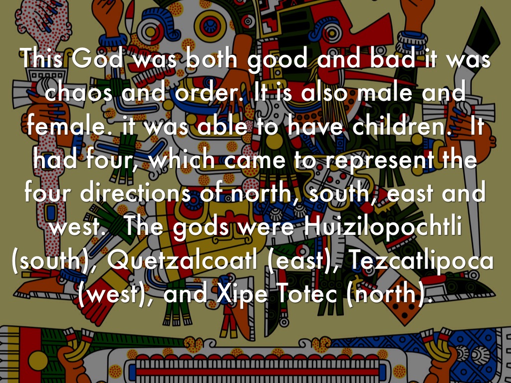 This God was both good and bad it was chaos and order. It is also male and female. it was able to have children. It had four, which came to represent the four directions of north, south, east and west. The gods were Huizilopochtli (south), Quetzalcoatl (east), Tezcatlipoca (west), and Xipe Totec (north).