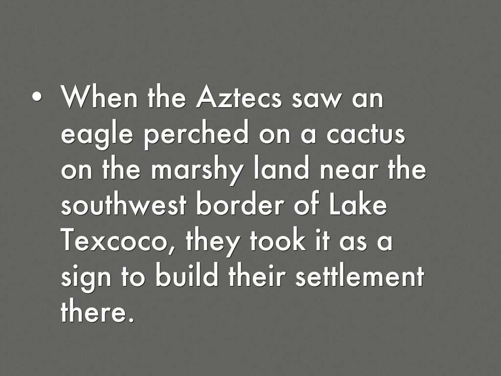 When the Aztecs saw an eagle perched on a cactus on the marshy land near the southwest border of Lake Texcoco, they took it as a sign to build their settlement there.