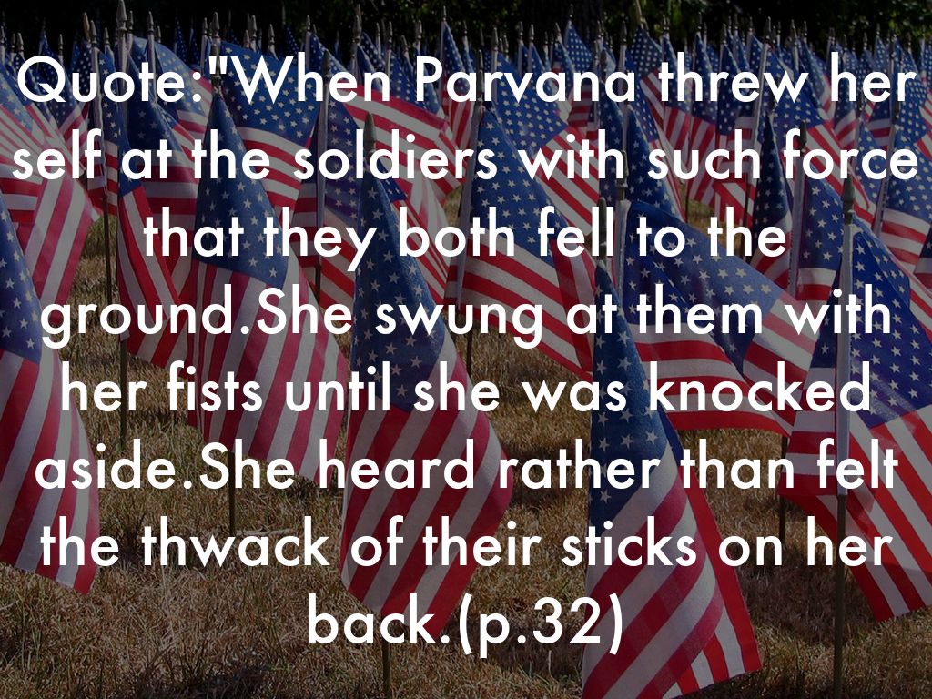 Quote:"When Parvana threw her self at the soldiers with such force that they both fell to the ground.She swung at them with her fists until she was knocked aside.She heard rather than felt the thwack of their sticks on her back.(p.32)