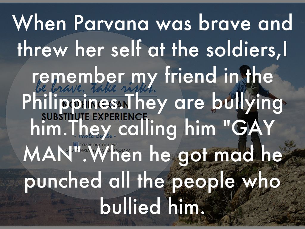 When Parvana was brave and threw her self at the soldiers,I remember my friend in the Philippines.They are bullying him.They calling him "GAY MAN".When he got mad he punched all the people who bullied him.