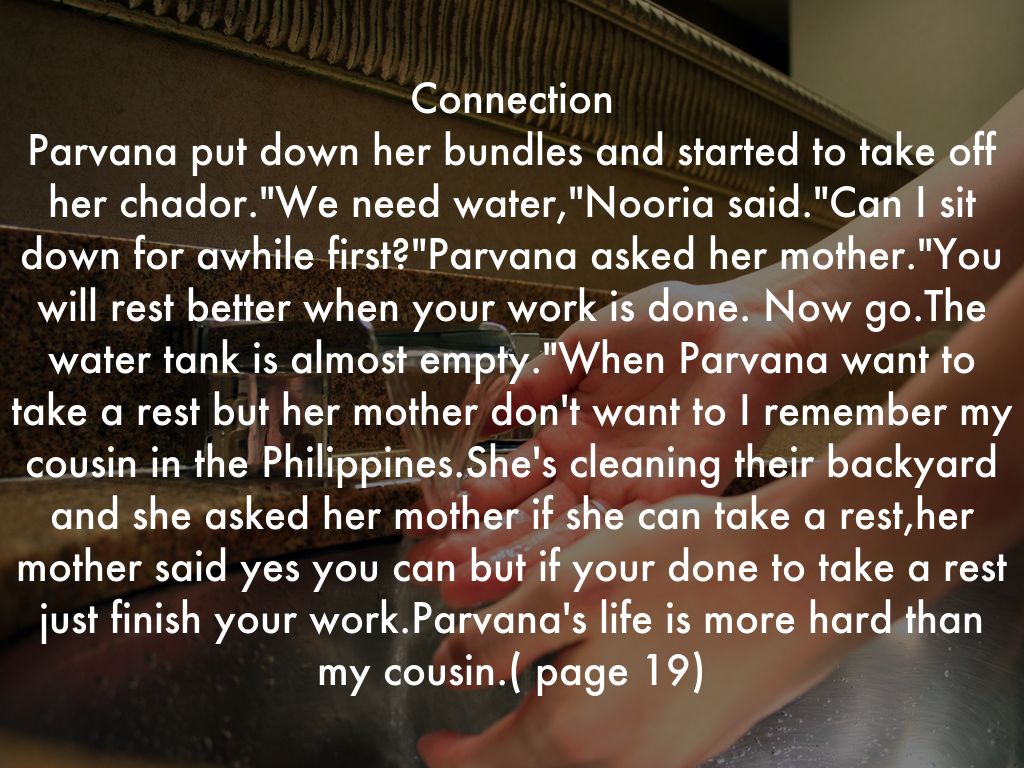 Connection Parvana put down her bundles and started to take off her chador."We need water,"Nooria said."Can I sit down for awhile first?"Parvana asked her mother."You will rest better when your work is done. Now go.The water tank is almost empty."When Parvana want to take a rest but her mother don't want to I remember my cousin in the Philippines.She's cleaning their backyard and she asked her mother if she can take a rest,her mother said yes you can but if your done to take a rest just finish your work.Parvana's life is more hard than my cousin.( page 19)