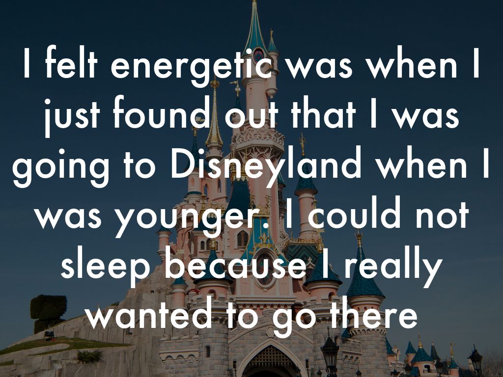 I felt energetic was when I just found out that I was going to Disneyland when I was younger. I could not sleep because I really wanted to go there. I will never froglet the awesome day when I went to Disneyland.