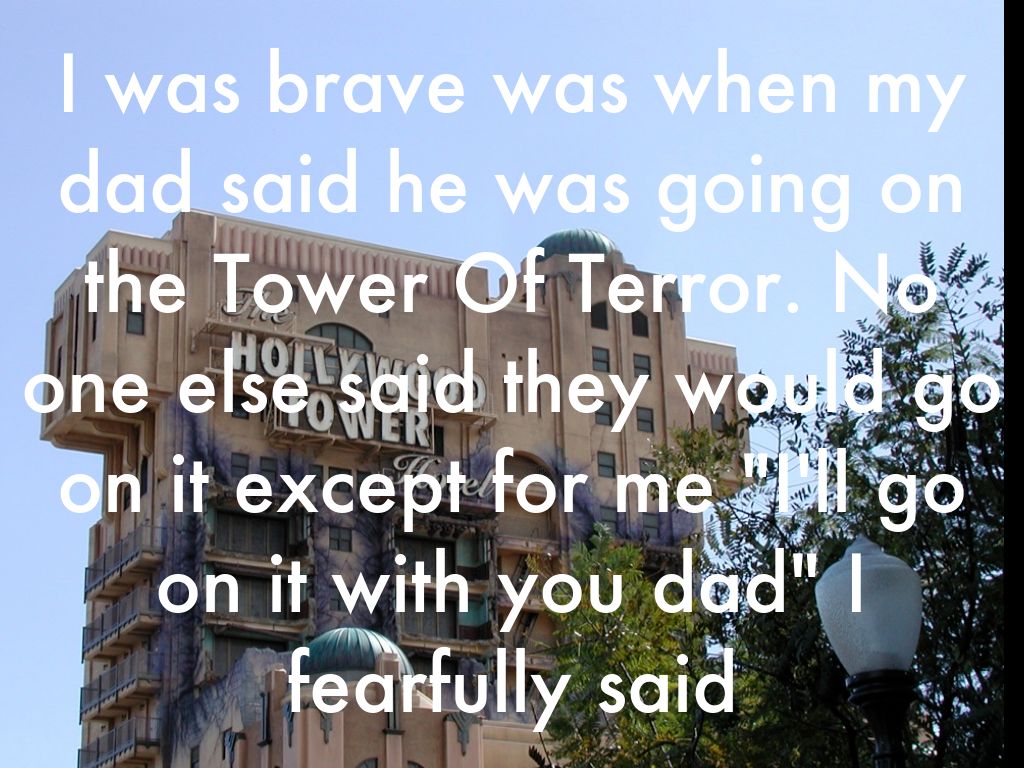 I was brave was when my dad said he was going on the Tower Of Terror. No one else said they would go on it except for me "I'll go on it with you dad" I fearfully said
