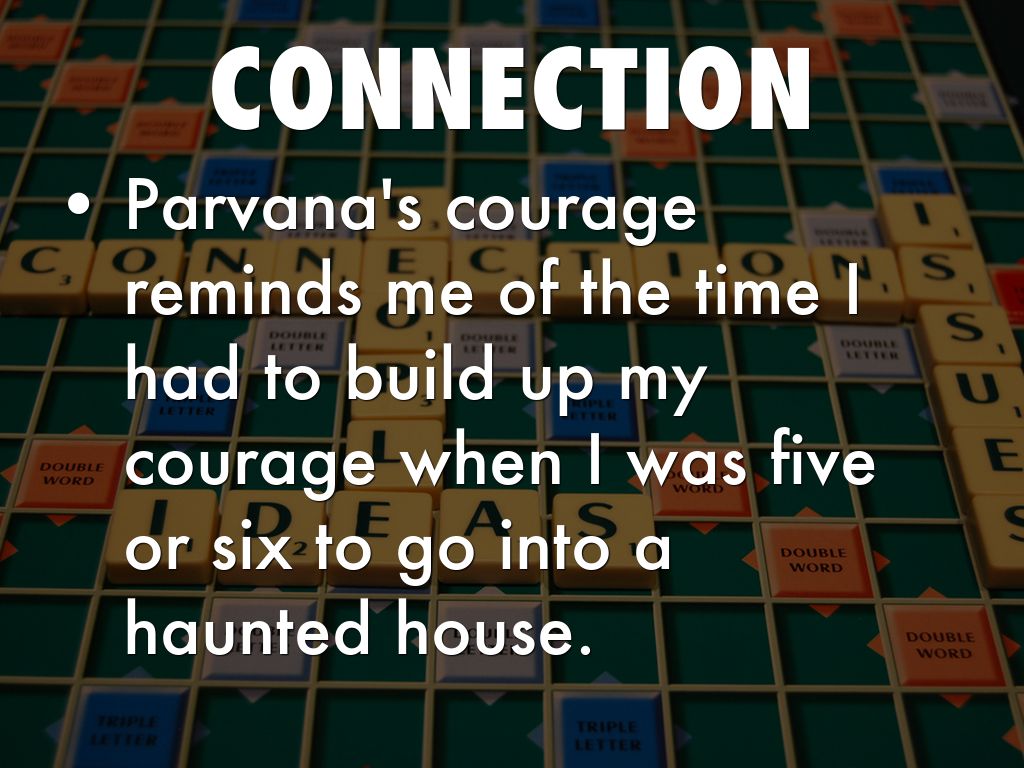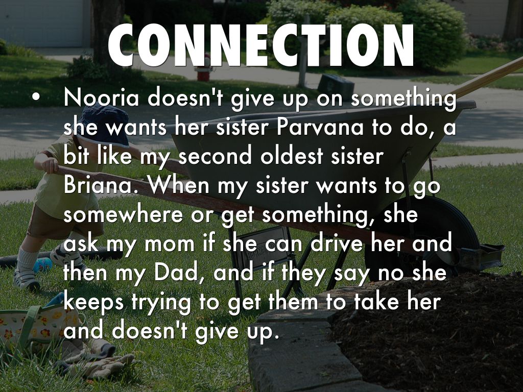 Nooria doesn't give up on something she wants her sister Parvana to do, a bit like my second oldest sister Briana. When my sister wants to go somewhere or get something, she ask my mom if she can drive her and then my Dad, and if they say no she keeps trying to get them to take her and doesn't give up.