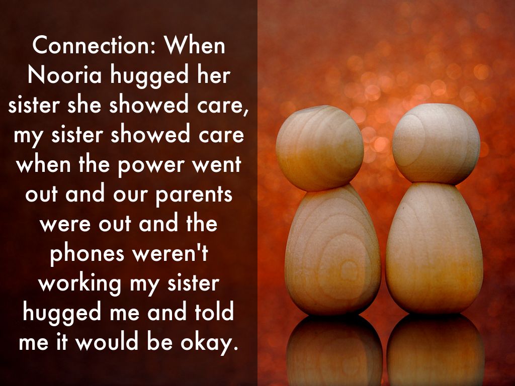 Connection: When Nooria hugged her sister she showed care, my sister showed care when the power went out and our parents were out and the phones weren't working my sister hugged me and told me it would be okay.