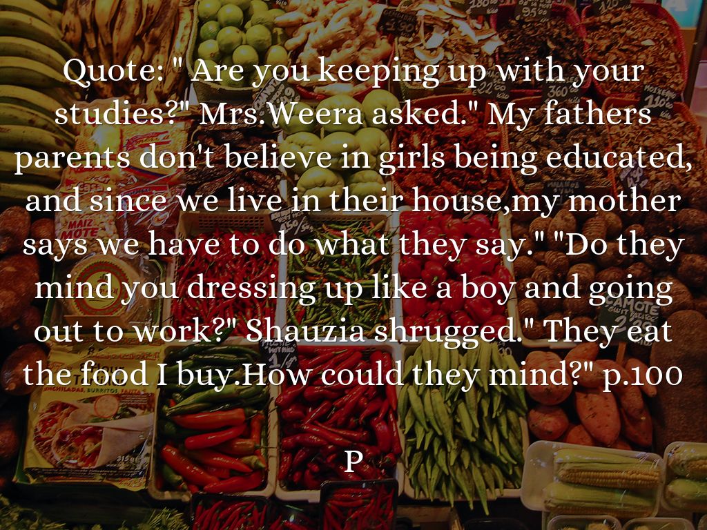 Quote: " Are you keeping up with your studies?" Mrs.Weera asked." My fathers parents don't believe in girls being educated, and since we live in their house,my mother says we have to do what they say." "Do they mind you dressing up like a boy and going out to work?" Shauzia shrugged." They eat the food I buy.How could they mind?" p.100