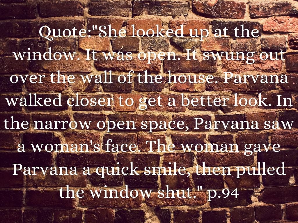 Quote:"She looked up at the window. It was open. It swung out over the wall of the house. Parvana walked closer to get a better look. In the narrow open space, Parvana saw a woman's face. The woman gave Parvana a quick smile, then pulled the window shut." p.94