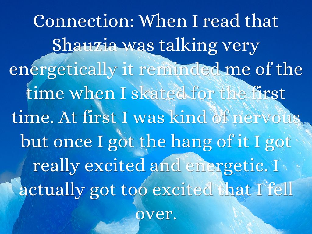 Connection: When I read that Shauzia was talking very energetically it reminded me of the time when I skated for the first time. At first I was kind of nervous but once I got the hang of it I got really excited and energetic. I actually got too excited that I fell over.