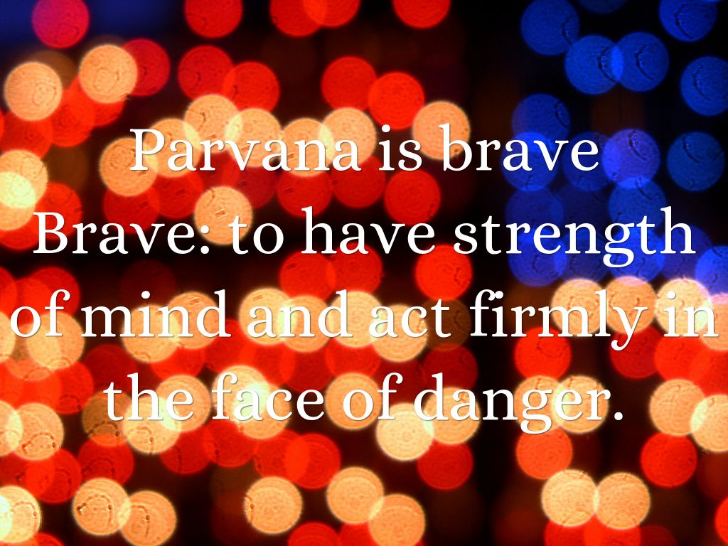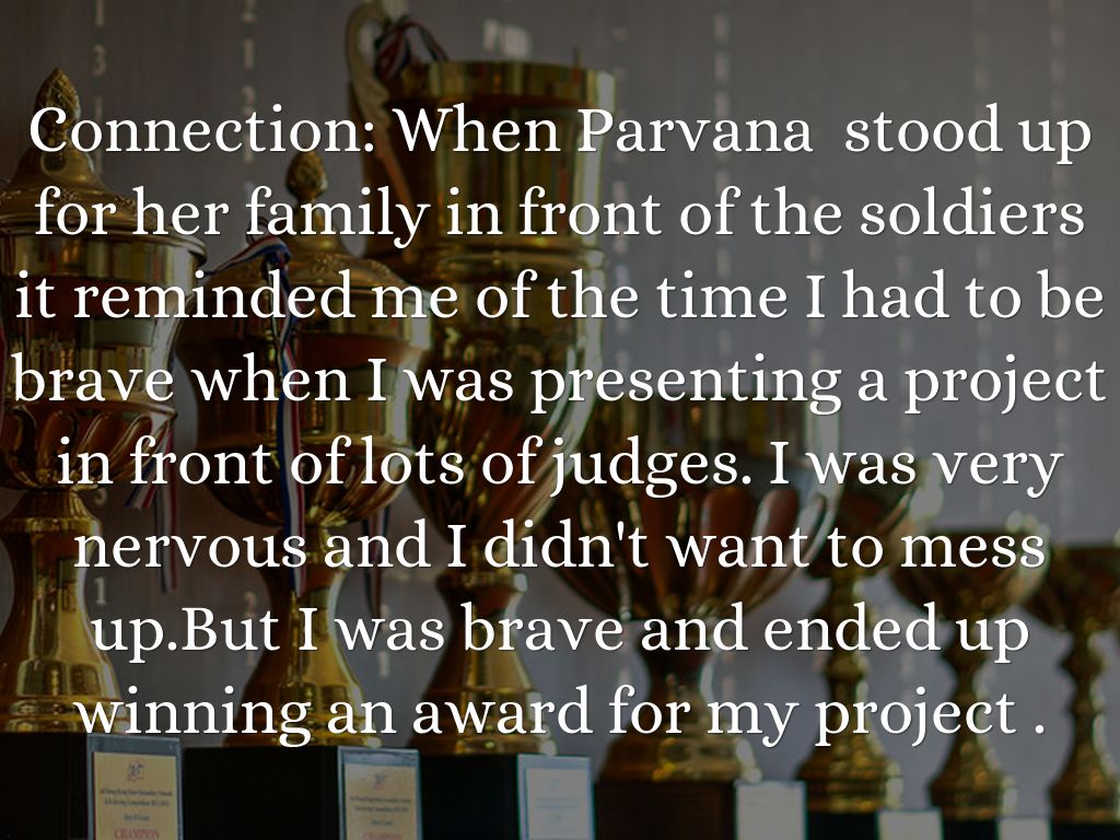 Connection: When Parvana stood up for her family in front of the soldiers it reminded me of the time I had to be brave when I was presenting a project in front of lots of judges. I was very nervous and I didn't want to mess up.But I was brave and ended up winning an award for my project .