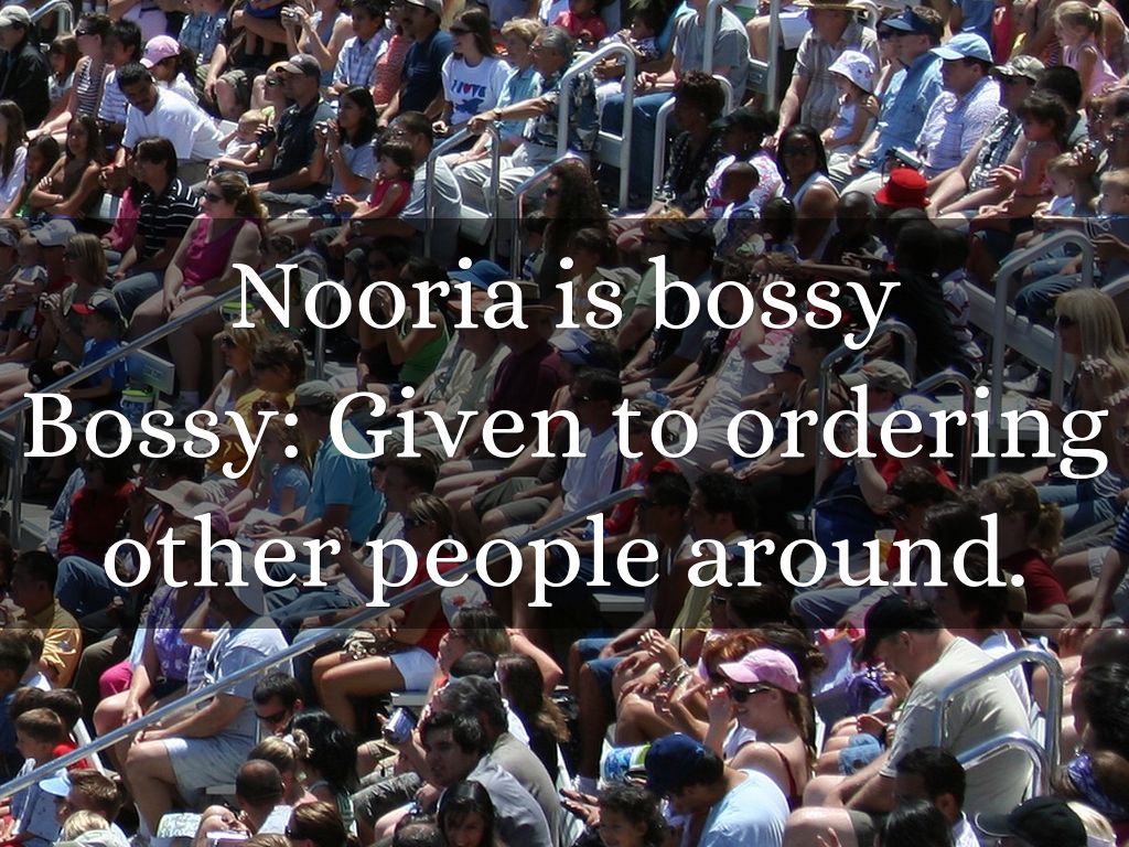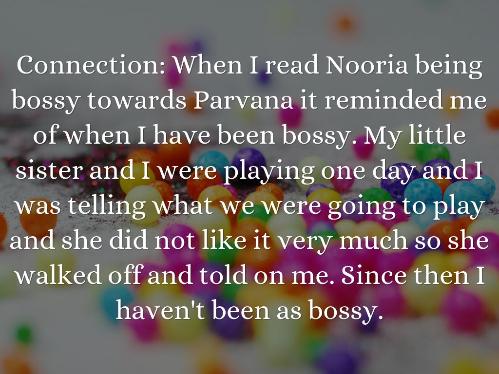 Connection: When I read Nooria being bossy towards Parvana it reminded me of when I have been bossy. My little sister and I were playing one day and I was telling what we were going to play and she did not like it very much so she walked off and told on me. Since then I haven't been as bossy.