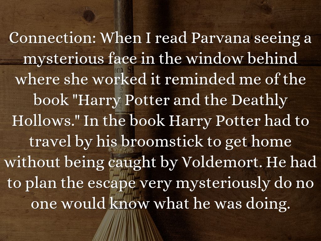 Connection: When I read Parvana seeing a mysterious face in the window behind where she worked it reminded me of the book "Harry Potter and the Deathly Hollows." In the book Harry Potter had to travel by his broomstick to get home without being caught by Voldemort. He had to plan the escape very mysteriously do no one would know what he was doing.