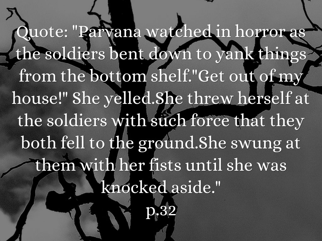 Quote: "Parvana watched in horror as the soldiers bent down to yank things from the bottom shelf."Get out of my house!" She yelled.She threw herself at the soldiers with such force that they both fell to the ground.She swung at them with her fists until she was knocked aside." p.32