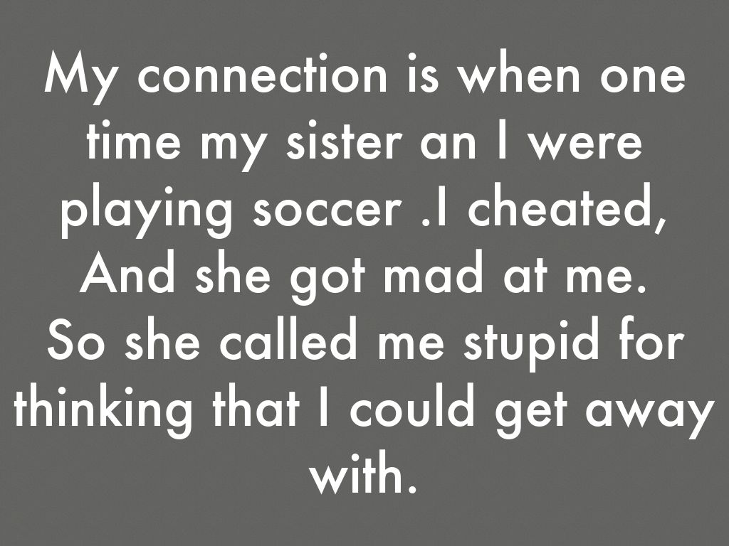 My connection is when one time my sister an I were playing soccer .I cheated,