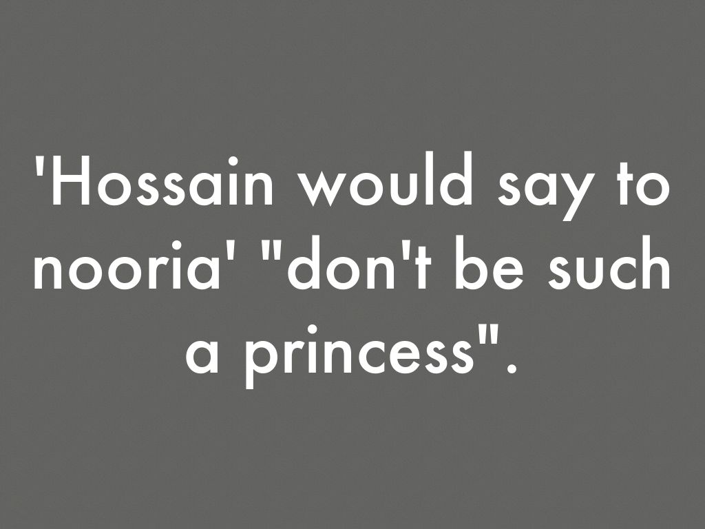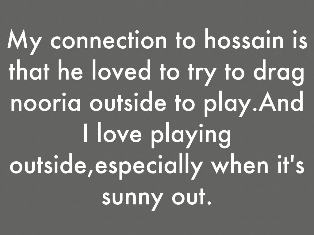 My connection to hossain is that he loved to try to drag nooria outside to play.And I love playing outside,especially when it's sunny out.